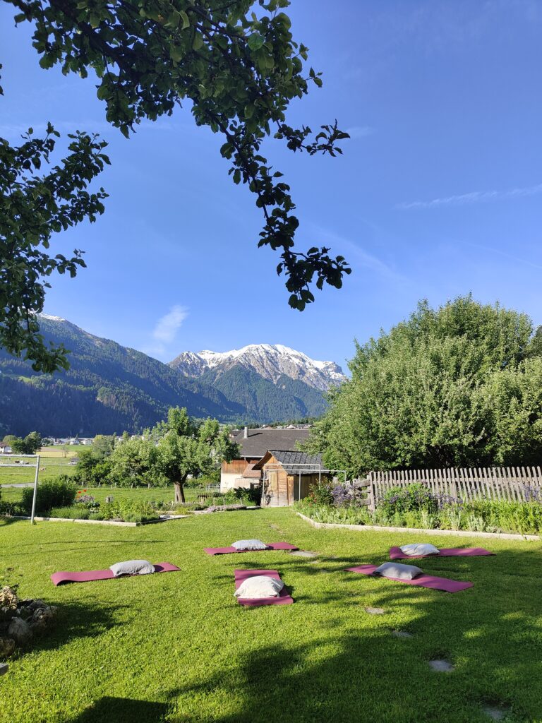Die Tage beginnen bewusst und ruhig – mit einem achtsamen Erwachen und einer Atemreise im Garten, wo du die frische Luft und die Natur direkt vor Ort mit allen Sinnen erleben kannst.